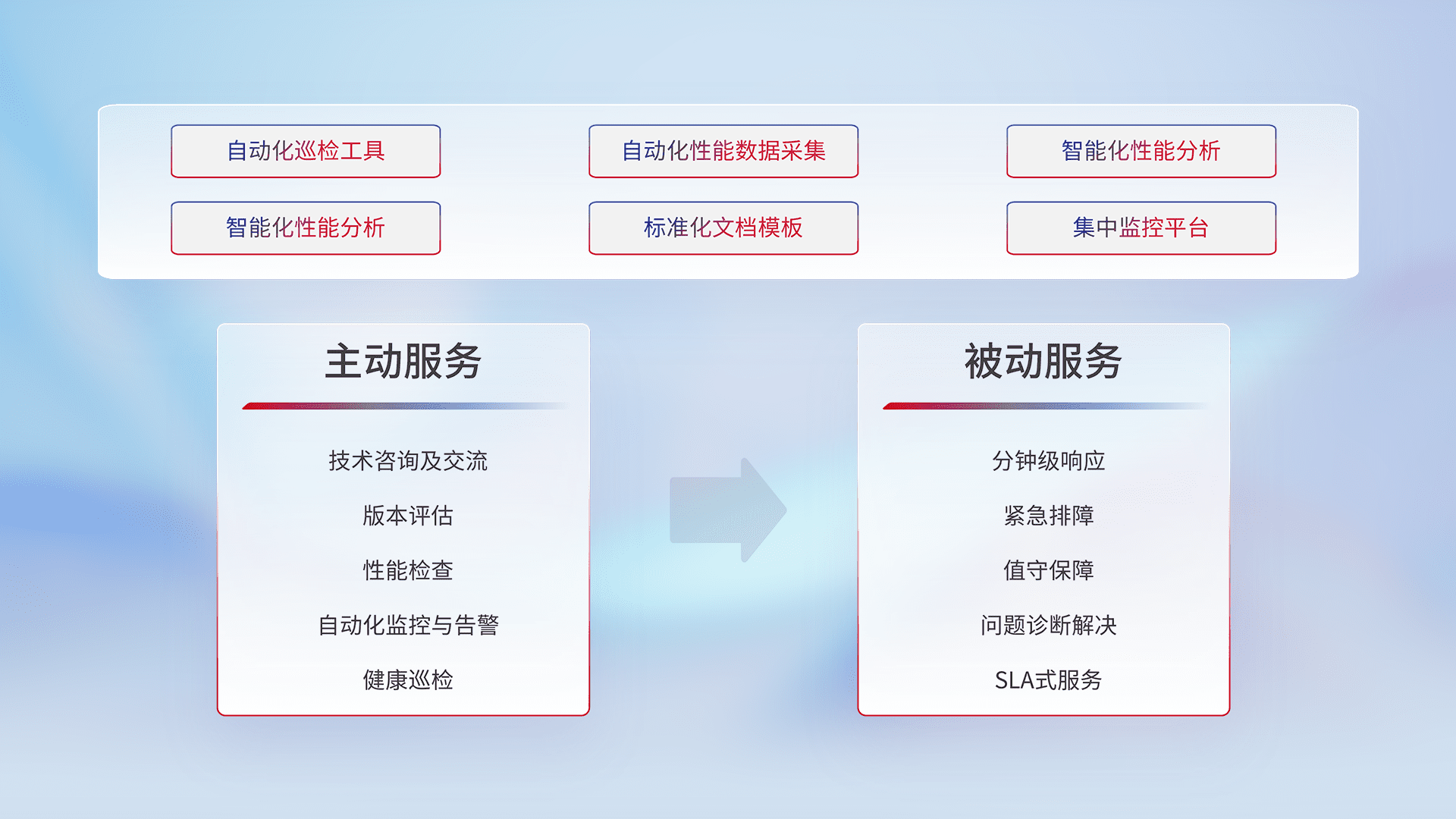 智能化工具和标准化文档,,保障服务质量,,,,提供主动服务(包含技术咨询、、版本评估、、、、性能检查、、、、自动化监控与告警、、、健康巡检)和被动服务包含(分钟级响应、、、紧急排障、、值守保障、、、问题诊断解决、、SLA服务)。。。